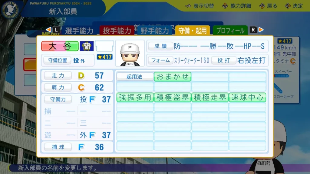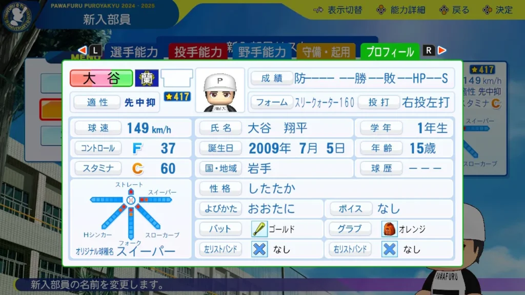 大谷翔平(おおたに しょうへい)の年代や出身都道府県をはじめ、選手能力やステータス、星の数、持っている特殊能力(金特・青特・赤特)まで、彼の性能をまるごと網羅。