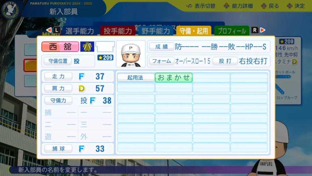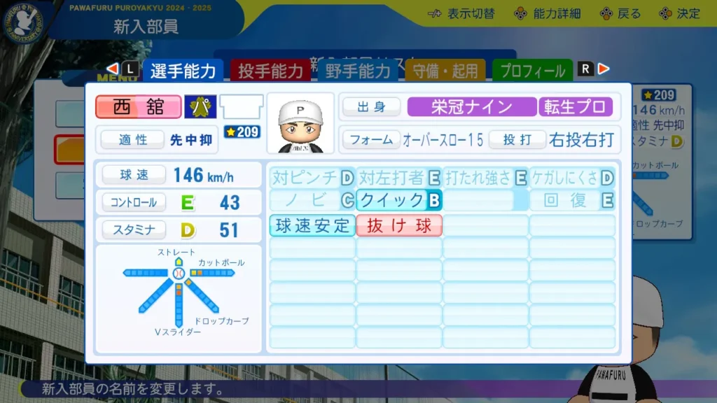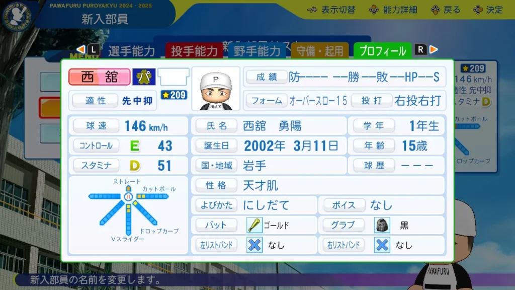 西舘勇陽(にしだて ゆうひ)の年代や出身都道府県をはじめ、選手能力やステータス、星の数、持っている特殊能力(金特・青特・赤特)まで、彼の性能をまるごと網羅。